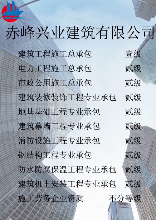 赤峰興業(yè)建筑有限公司簡介 赤峰興業(yè)建筑有限公司成立于1998年7月,位于內(nèi)蒙古赤峰市松山區(qū)。現(xiàn)已發(fā)展成為擁有建筑工程施工總承包壹級、電力工程施工總承包貳級、市政公用工程施工總承包貳級、承裝、修、試四級、?建筑裝修裝飾工程專業(yè)承包貳級、建筑幕墻工程專業(yè)承包貳級、消防設(shè)施工程專業(yè)承包貳級、地基基礎(chǔ)工程專業(yè)承包貳級、鋼結(jié)構(gòu)工程專業(yè)承包貳級、建筑機電工程專業(yè)承包二級、防水防腐保溫工程專業(yè)承包貳級以及建筑施工勞務等資質(zhì)的綜合性建筑施工企...